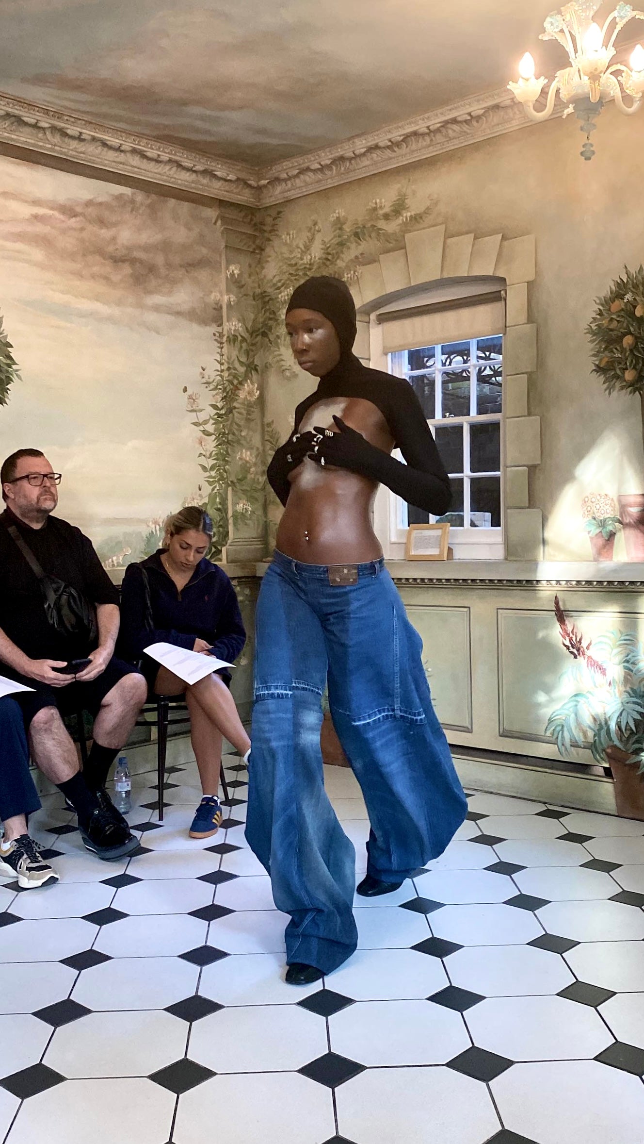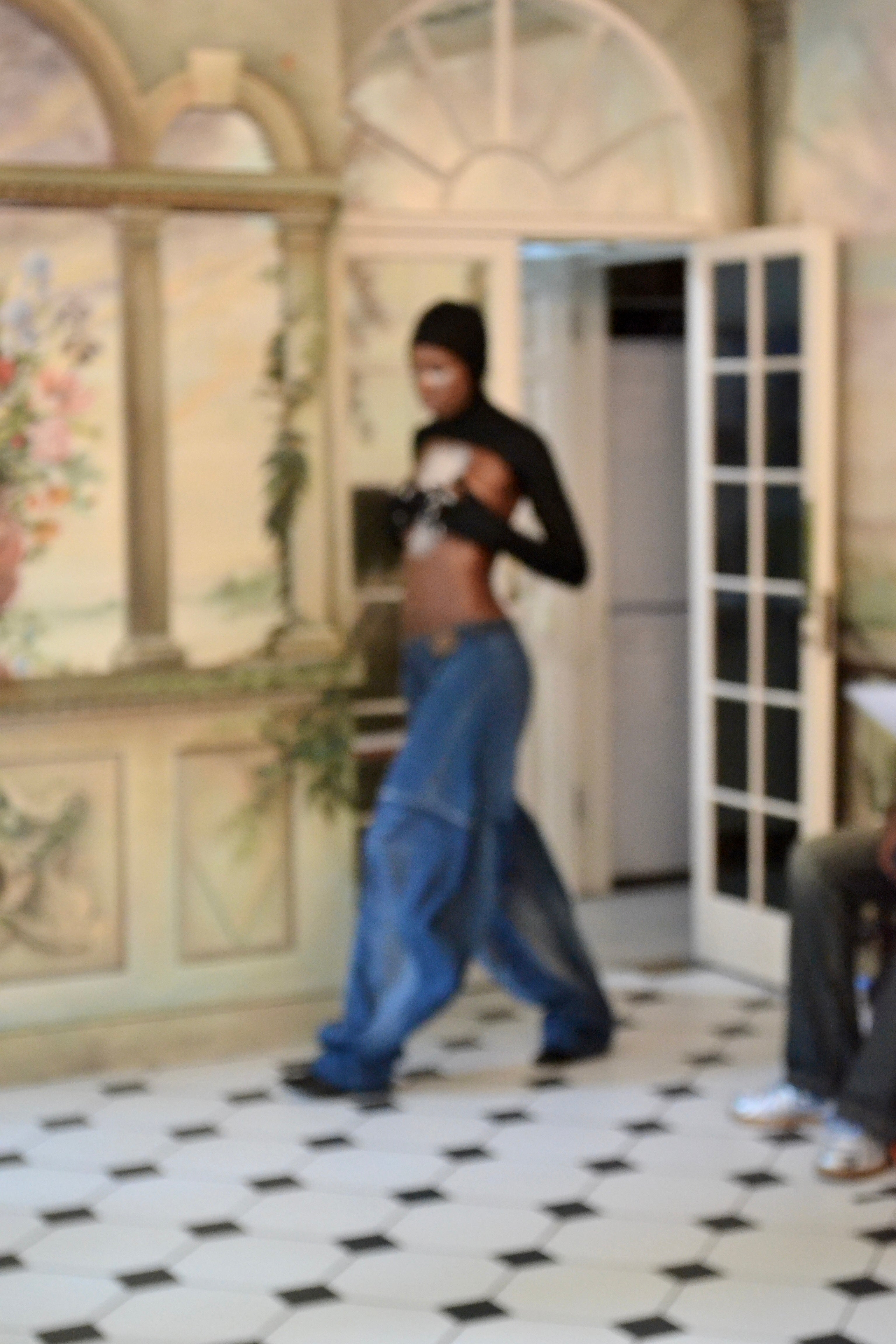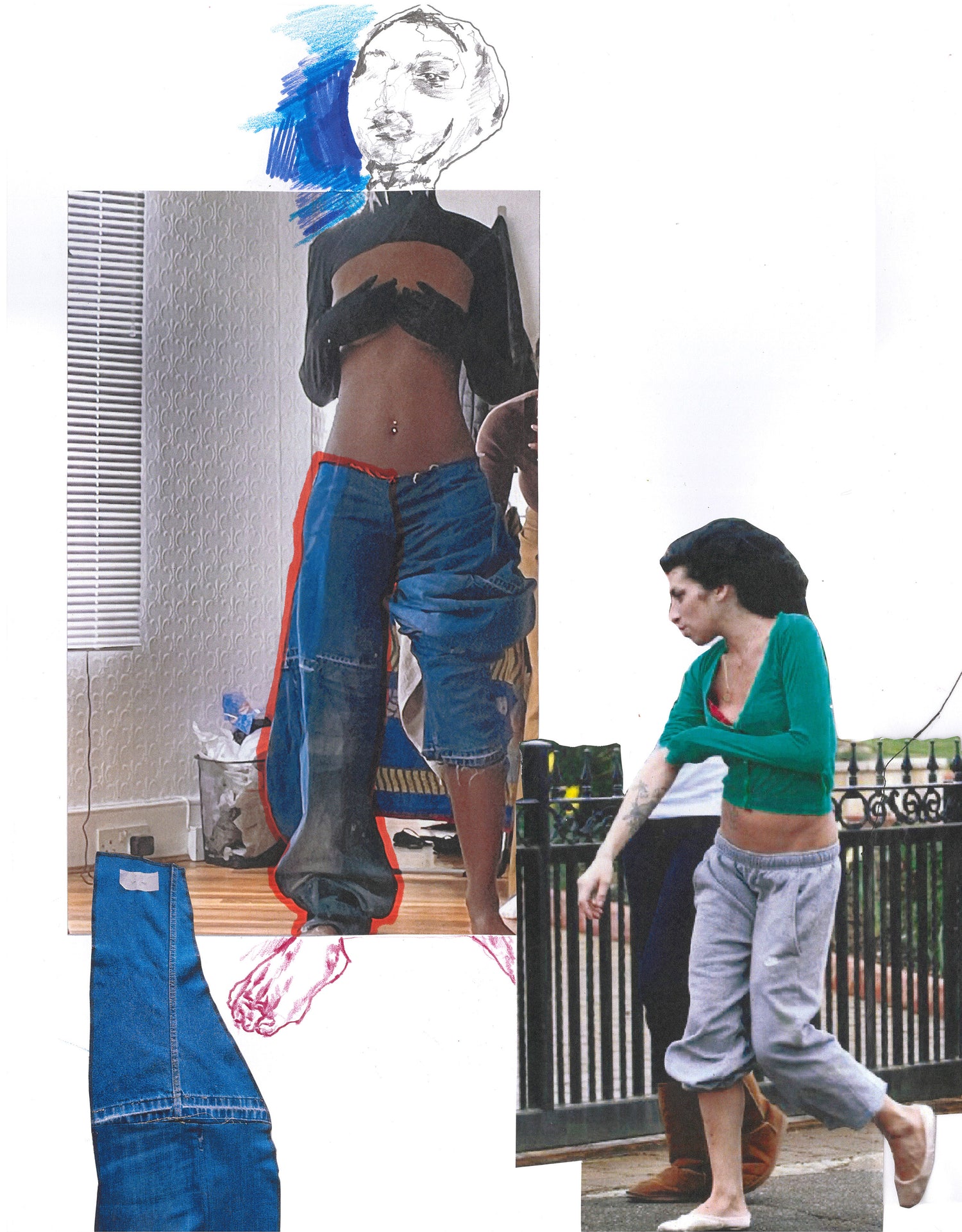 Drawing into the functionality of the tracksuit bottoms I progressed forward into ruching the denim fabric. While doing so I watched as the bellowing weight of the fabric hung rolling like the languorous curves of a wave at the ankle. I decide at this moment to cease my incessant investigation of the material right then and there and let it communicate itself. This is how the final silhouette choice came to be.